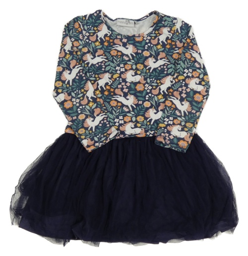 Tmavomodro-zelené vzorované šaty s jednorožcami a tylovou sukní