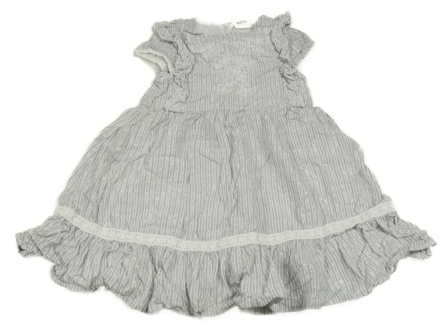 Sivo-biele pruhované trblietavé plátenné šaty s výšivkou a volániky s madeirou Topolino