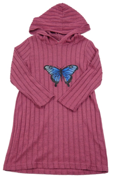 Ružovo-sivé melírované rebrované svetrové šaty s motýlom a kapucňou