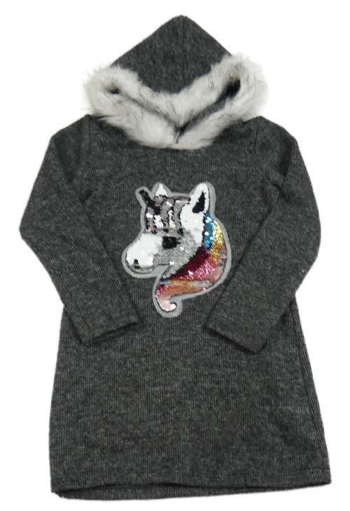 Tmavosivé melírované pletené šaty s jednorožcom a kapucňou