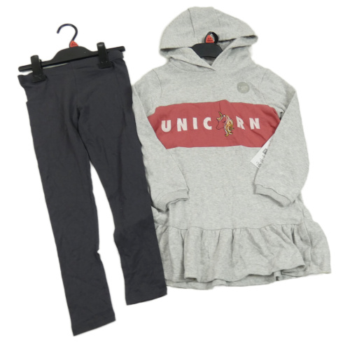 Nové - 2set - Sivo-vínové teplákové šaty s jednorožcom a kapucí + antracitové legíny