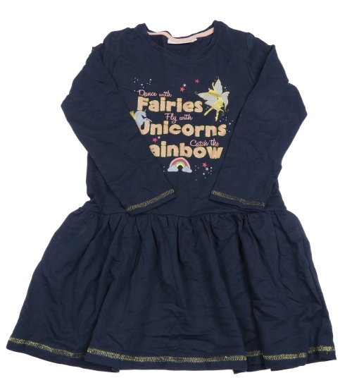 Tmavomodré bavlnené šaty s nápisom a jednorožcom s vílou