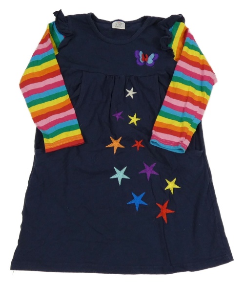 Tmavomodré šaty s hviezdičkami a motýlkom a volánikmi a farebnymi pruhovanymi rukávy