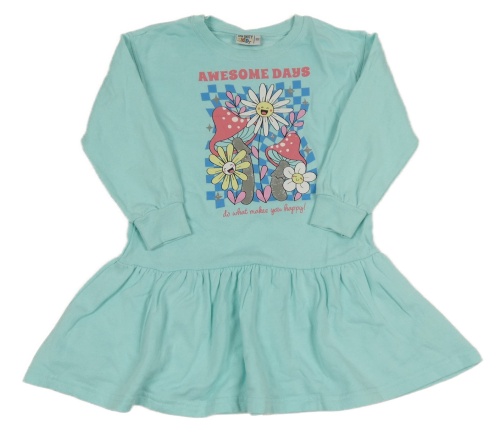 Svetlomodré teplákové šaty s houbami a nápismi