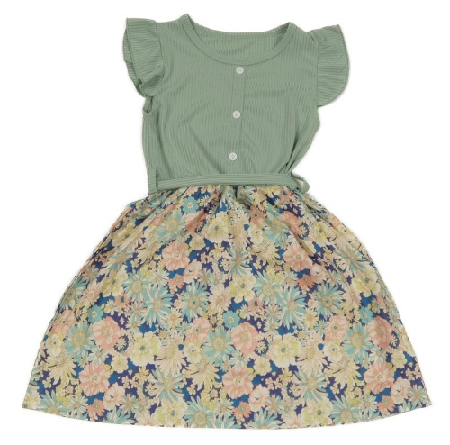 Tmavomodro-olivové kvetované rebrované šaty s volánikmi a opaskom