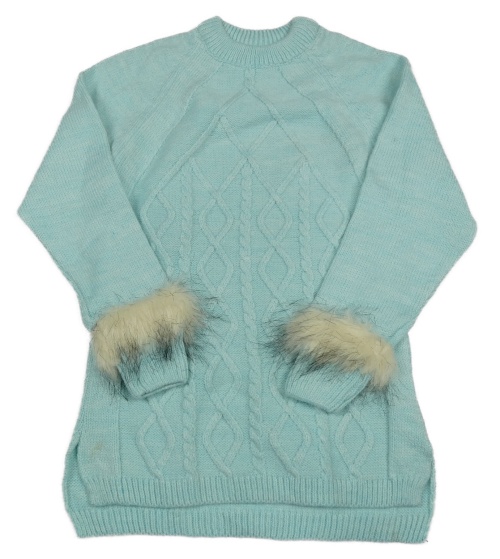 Svetlomodré vzorované svetrové šaty s kožešinou na rukávech