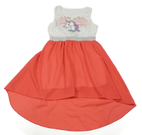 Bielo-korálové šifónové šaty s jednorožcem z flitrů