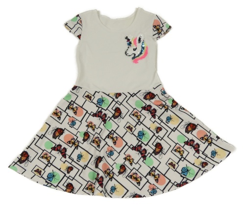 Bielo-čierne vzorované šaty s jednorožcem z flitrů a motýlikmi a farebnymi bodky