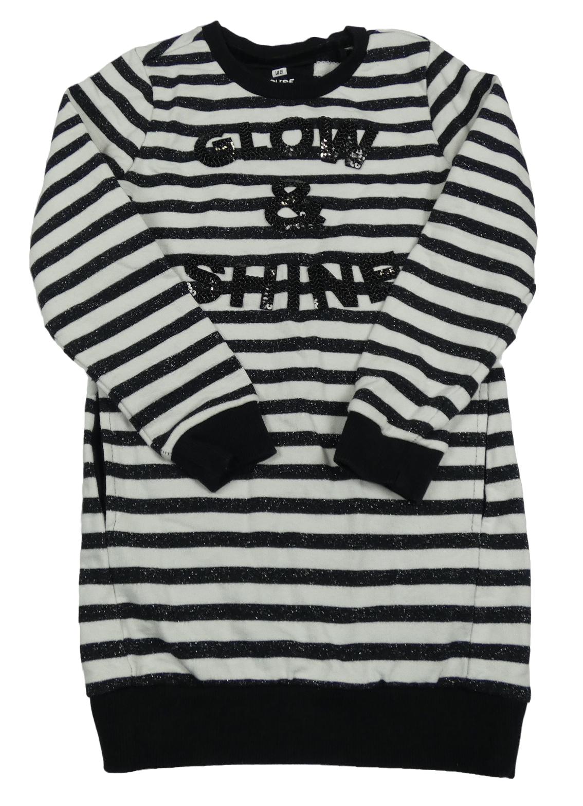 Čierno-biele pruhované trblietavé teplákové šaty s nápisem z flitrů