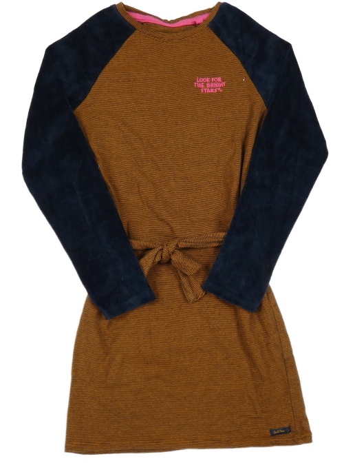 Hnedé pruhované šaty s tmavomodrymi zamatovymi rukávy a opaskom WE