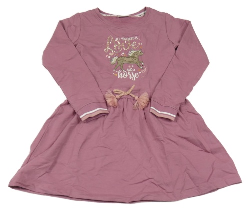 Fialové teplákové šaty s nápismi a koníkem