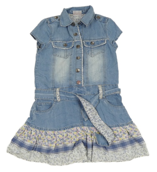 Svetlomodré rifľové šaty s kvetovanymi volániky a opaskom Yigga