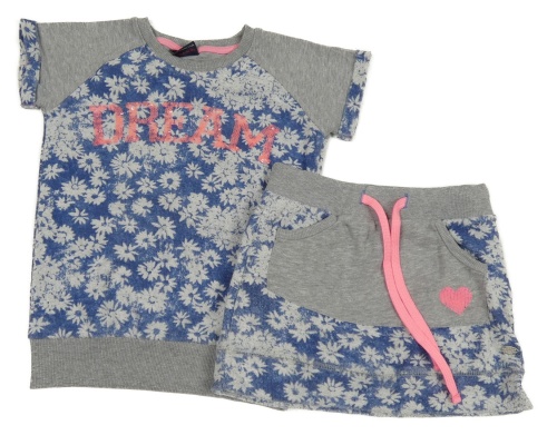 2Set - Modro-sivo-biela kvetovaná tepláková sukňa so srdíčkem z flitrů + teplákové tričko s nápisom Tom-Du