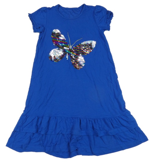 Královsky modré šaty s motýlkem z překlápěcích flitrů a volánikom JAKO-O