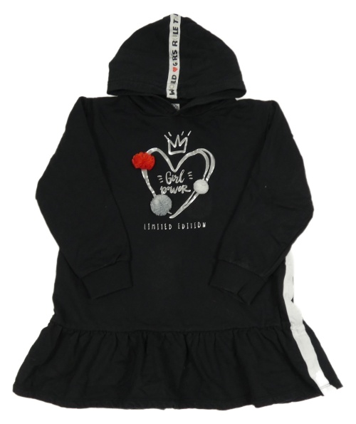 Čierno-biela tepláková šatová tunika so srdiečkom a bambulkami a nápismi a kapucňou Charanga