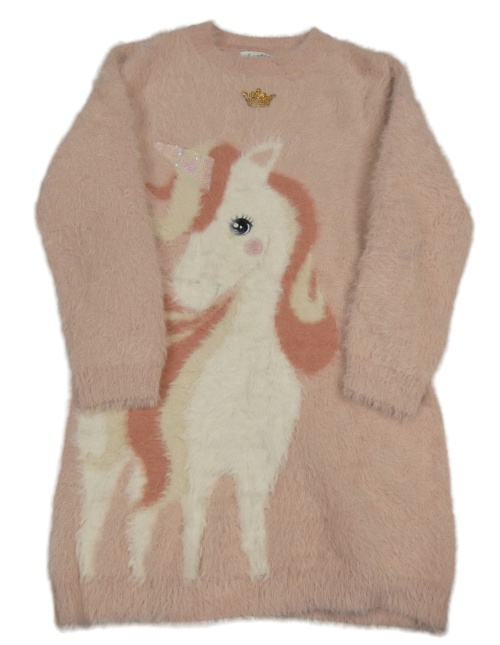 Svetloružové svetrové chlpaté šaty s jednorožcem z flitrů C&A