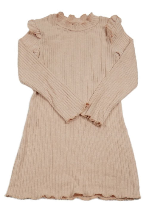 Pudrové rebrované úpletové šaty s volánikmi a rolákom