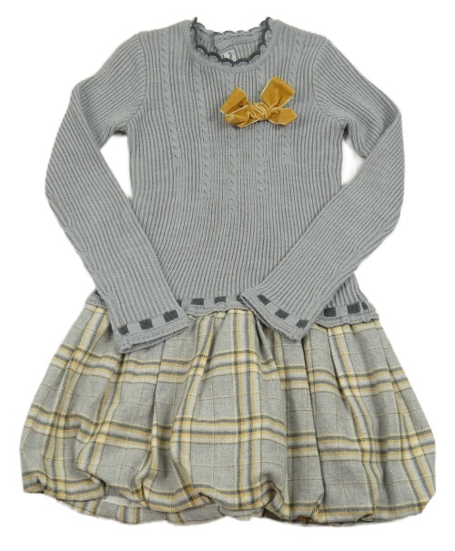 Sivo-okrovo-bielo-tmavosivé kockované vlnené balonové šaty s mašlou a vzorom Miranda