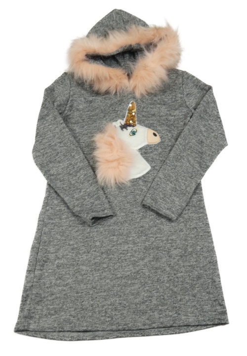 Sivé melírované úpletové šaty s jednorožcom a kapucňou s kožešinou