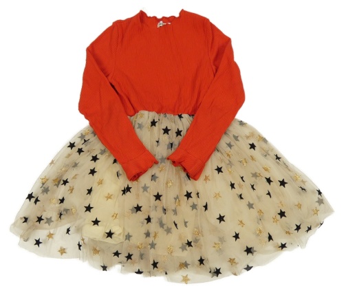 Červeno-béžové rebrované šaty s tylovou sukní s hviezdami