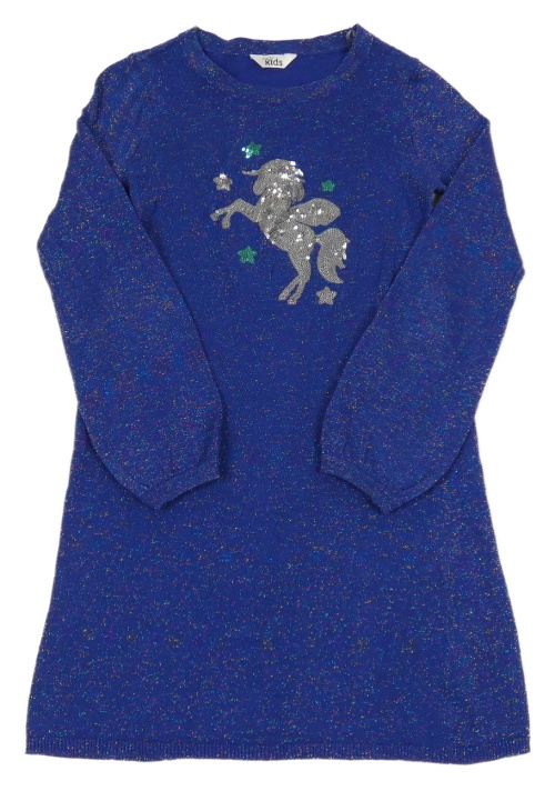 Tmavomodro-farebné úpletové trblietavé šaty s jednorožcem z flitrů M&Co.