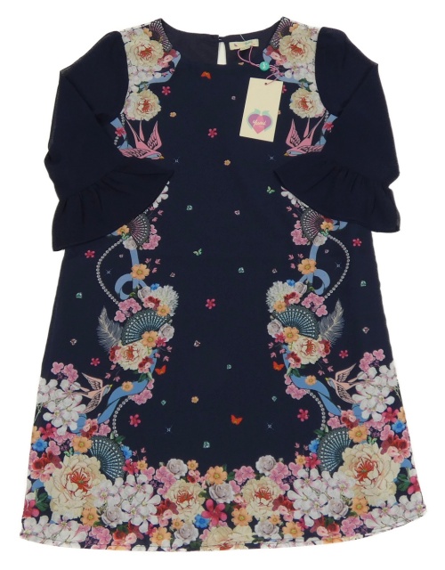 Nové - tmavomodré šaty s kvietkami a vtáčky a vějíři Yumi