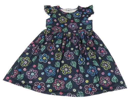 Tmavomodro-farebně bodkovaná é šaty s kvetmi a lístečky a volánikmi