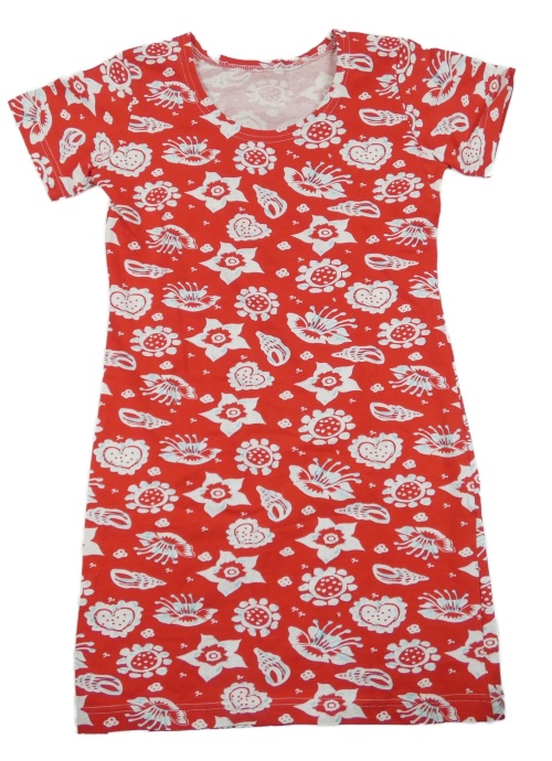 Červené šaty s kvety s mušličkami a srdiečkami