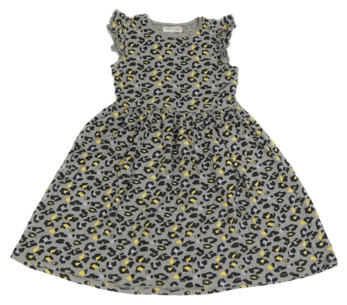 Sivo-čierno-žlto-fialové šaty s leopardím vzorom a volánikmi