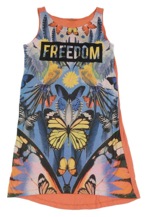 Oranžovo-farebné šaty s motýly a nápisom Y.F.K.