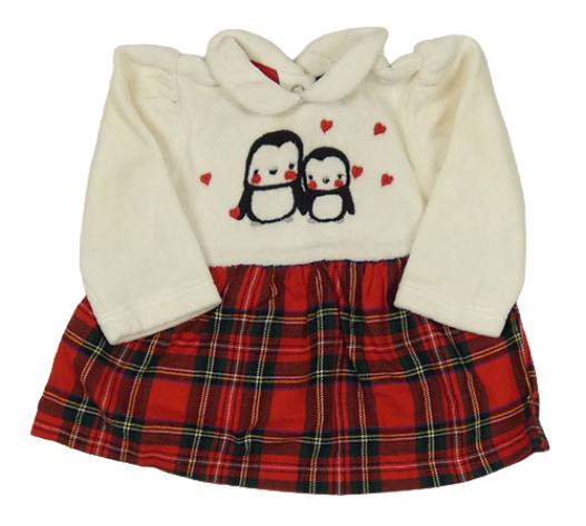 Smetanovo-červeno-farebná sametovo/plátěná šatová tunika s tučňáky a kostkovanou sukní Prénatal
