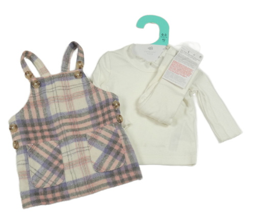 • Nové - 3set - Biele rebrované triko + biele punčocháče + bielo-šero-ružovo-fialové kockované na traké vlnené šaty Primark