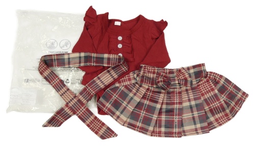 Nové - 3set - Kockovaná skladaná sukně + červené rebrované body + mašľa