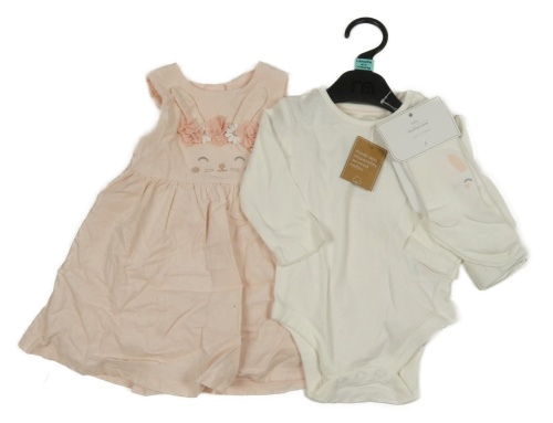 • Nové - 3set - Svetloružové menšestrové šaty s králikmi s květy + biele body + biele pančuchy Mothercare