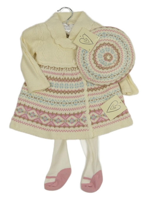 • Nové - 3Set - Smetanovo-ružovo-modro-hnedé vzorované svetrové šaty s límečkem + baret + bílo/růžové pančuchy