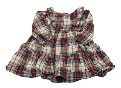 Béžovo-červeno-tmavomodré kockované trblietavé šaty s volánikmi F&F