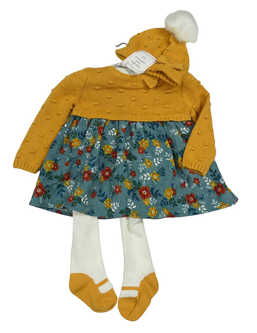 • Nové - 3set - Okrovo-modrošedé svetrovo/žebrované šaty s květy + pletená čapica s bambulí + biele pančuchy