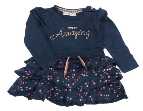 Tmavomodré teplákové šaty s nápismi a hviezdičkami a volánikmi Dirkje
