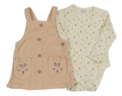 • 2Set - Světlepudrové menšestrové šaty s čumáčky/kapsami a knoflíky + smetanovo/barevné vzorované rebrované body F&F;;