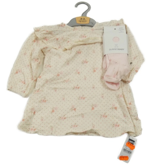 Nové - 2set - Krémové bodkovaná é šaty s kvetinami a volánem + svetloružové rebrované pančuchy Dunnes
