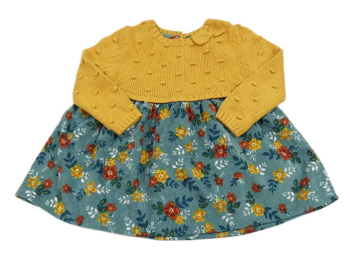 Okrovo-modré pletené/manšestrové šaty s květovanou sukní