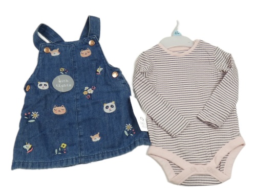 Nové - 2set - Modré rifľové na traké šaty s výšivkami zvířat a květů + ružovo-čierne pruhované rebrované body F&F