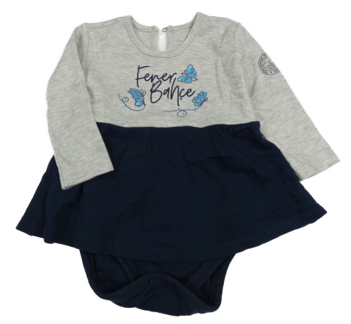 Sivo-tmavomodrá melírovaná šatová tunika s motýlikmi a nápismi a všitým body