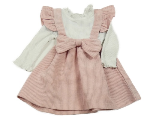 Bielo-ružové rebrované šaty s mašlou a volánikmi