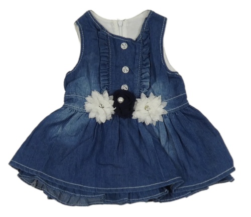 Tmavomodré rifľové šaty s tylovými květinami v pase