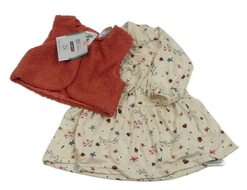 2set - Béžové šaty s listami a žaludy + korálová huňatá podšitá vesta Ergee