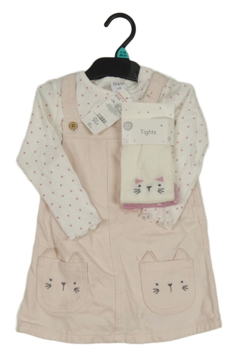 Nové - 3set - Svetloružové rifľové na traké šaty s vreckami s kočkami + biele bodkovaná é rebrované body + biele pančuchy s mačkou F&F