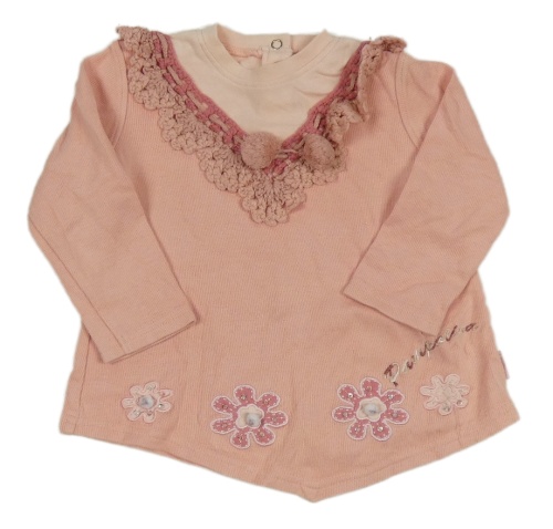 Ružová mikinová tunika s volánikom a kvetmi a bambulemi