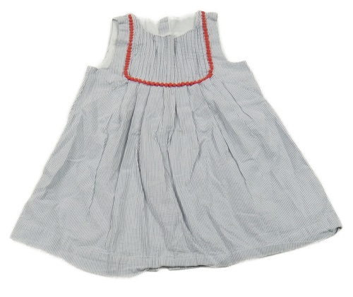 Světlemodro-biele pruhované šaty s červenou ozdobou