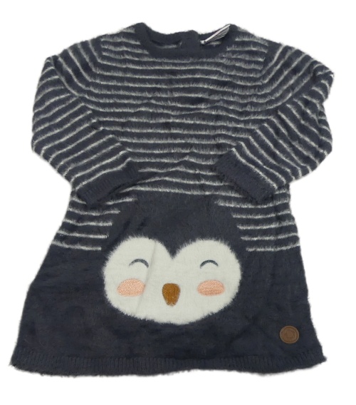 Tmavošedo-biele pruhované chlpaté svetrové šaty s tučňáčkem Topomini